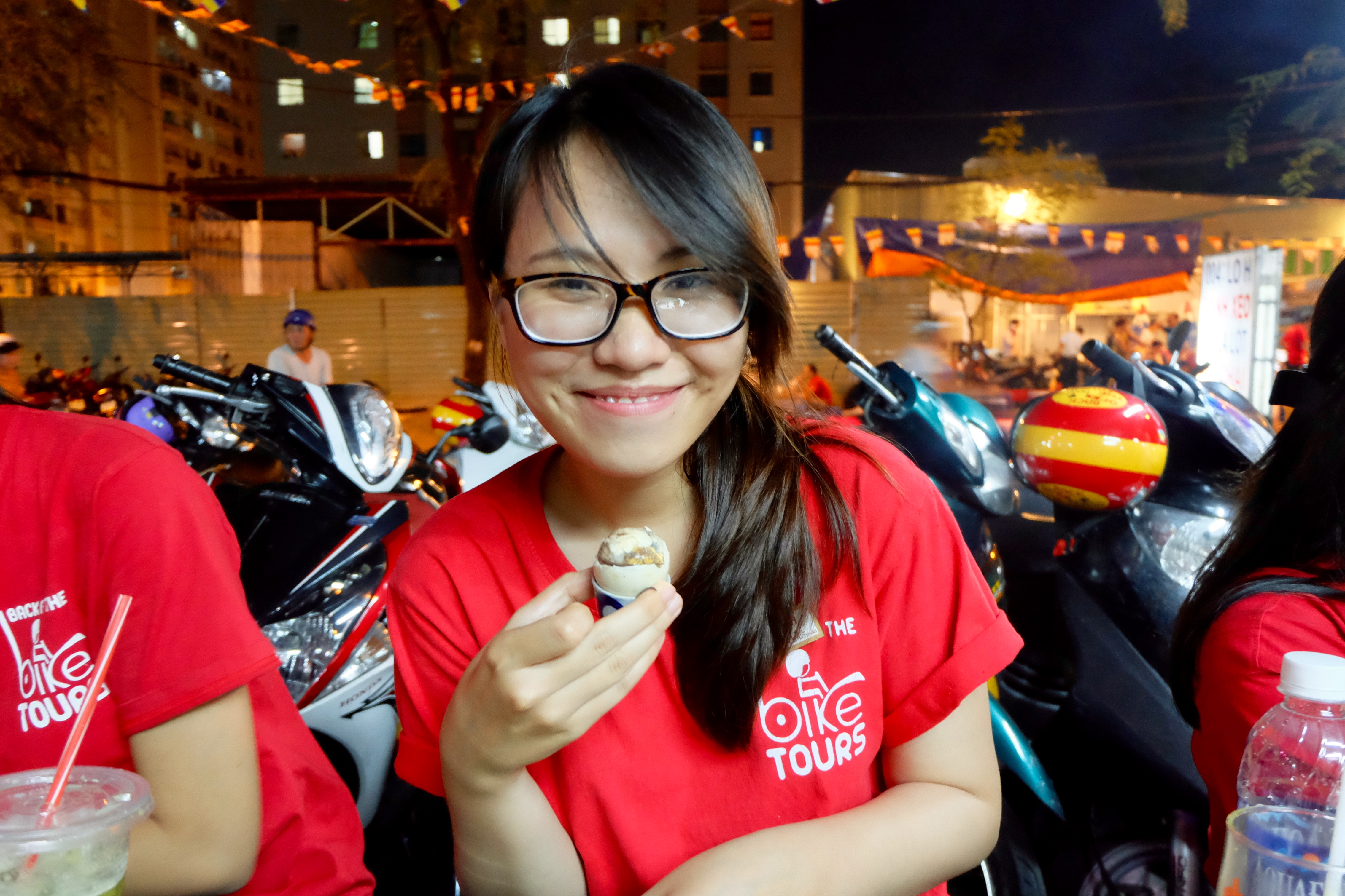 • Back of bikes tour – this was amazing! One of my favourite things so far on my trip. You go on the back of a scooter through different districts (yes HCMC has districts just like The Hunger Games) and try lots of different street foods that you would never come across by yourself. A lot of these stalls are down alley ways, or perched on busy main roads in front of shops. One of the stalls we went to is so popular that the woman who runs it managed to send her son to University in America! Below is a list of some of the foods I tried while on the tour.  They also had a food challenge. It was to eat a local delicacy – a fertilised duck egg. I couldn’t eat it though…